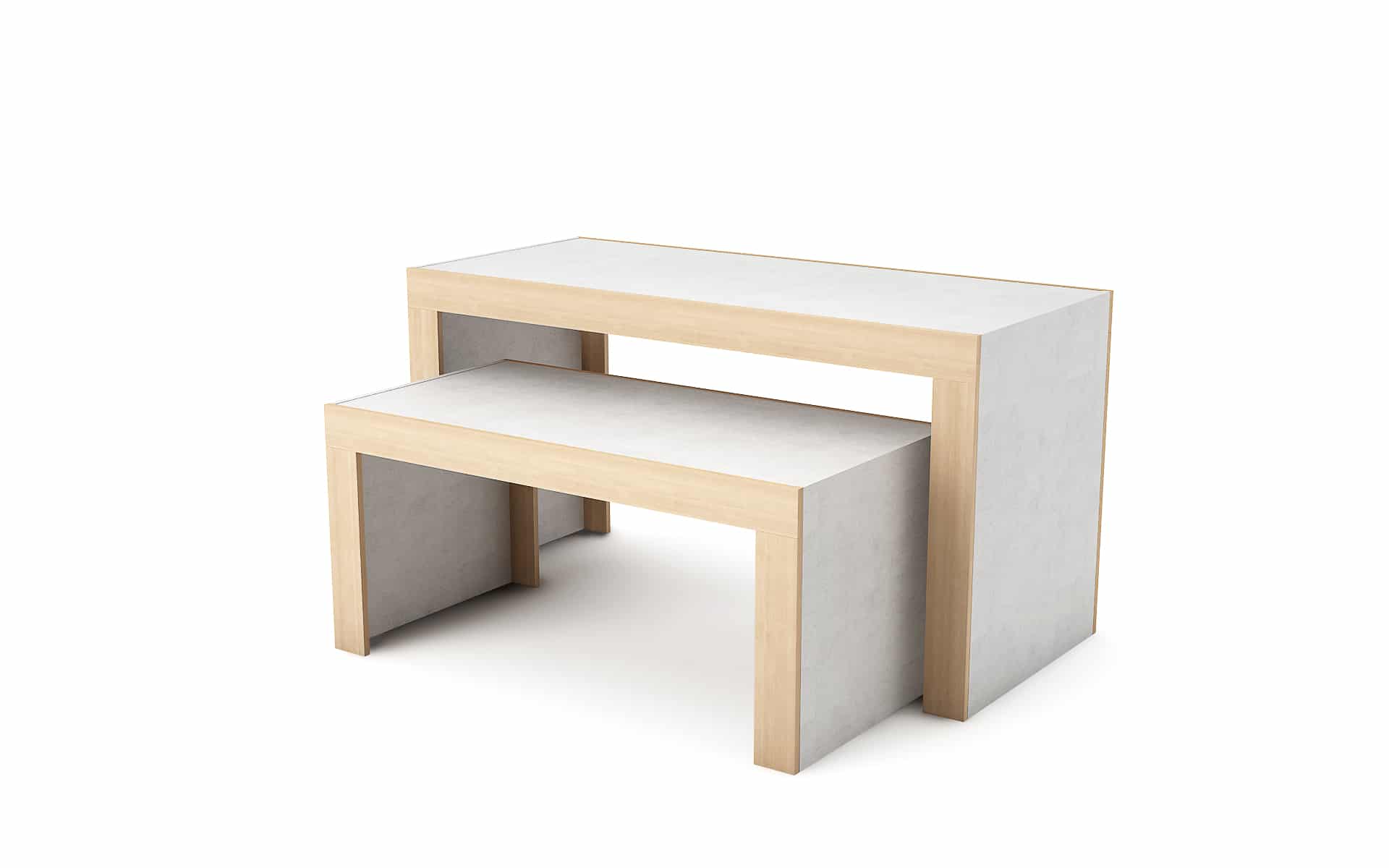 Vielseitig einsetzbar: Dieses Set aus zwei Tischen lässt sich perfekt kombinieren oder separat verwenden, um verschiedene Ausstellungsbedürfnisse zu erfüllen