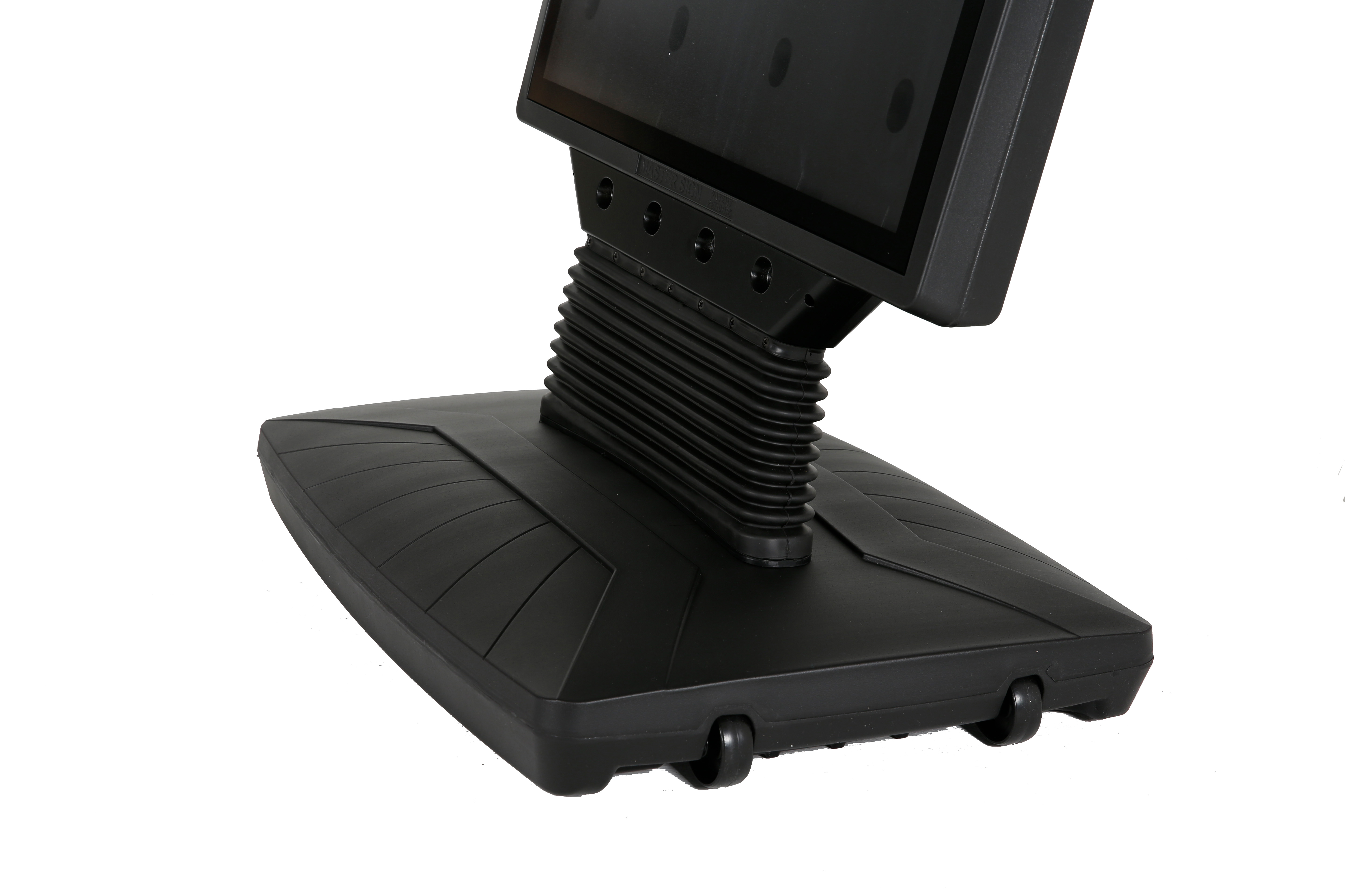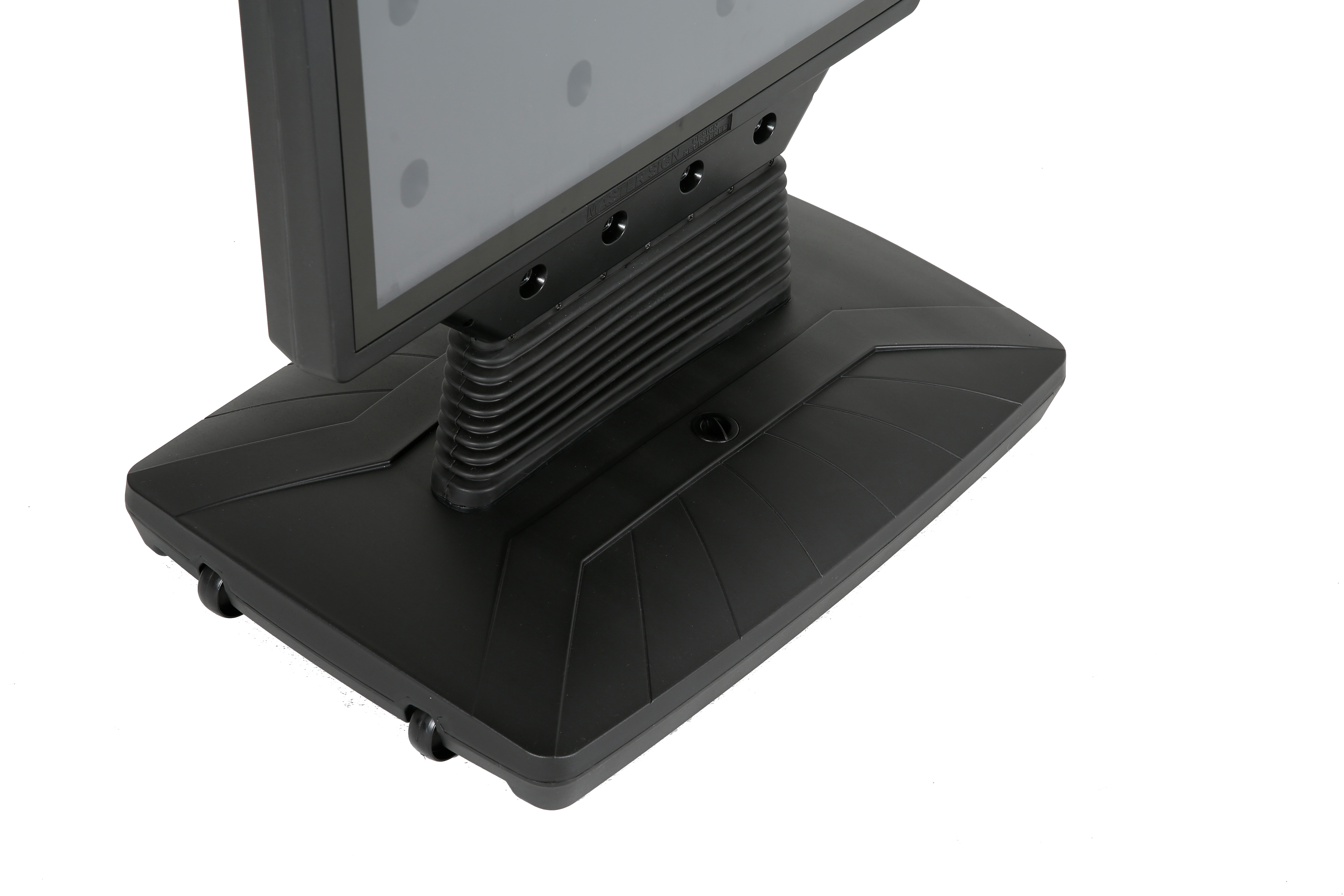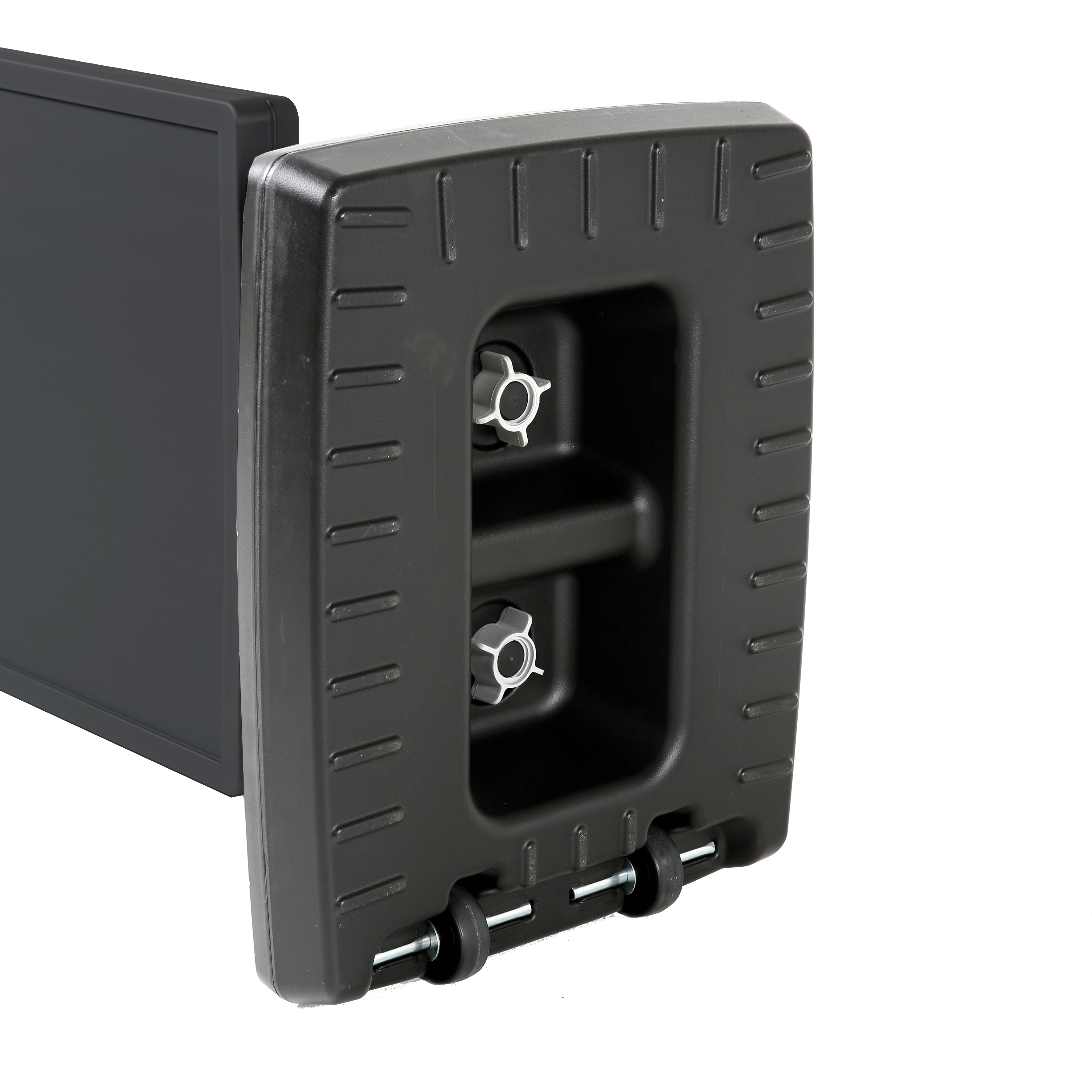 Wasserbefüllbarer Kunststoff-Fuß mit Laufrollen: Der Fuß lässt sich mit Wasser befüllen, um zusätzliche Stabilität zu gewährleisten, während die Laufrollen den Transport erleichtern.