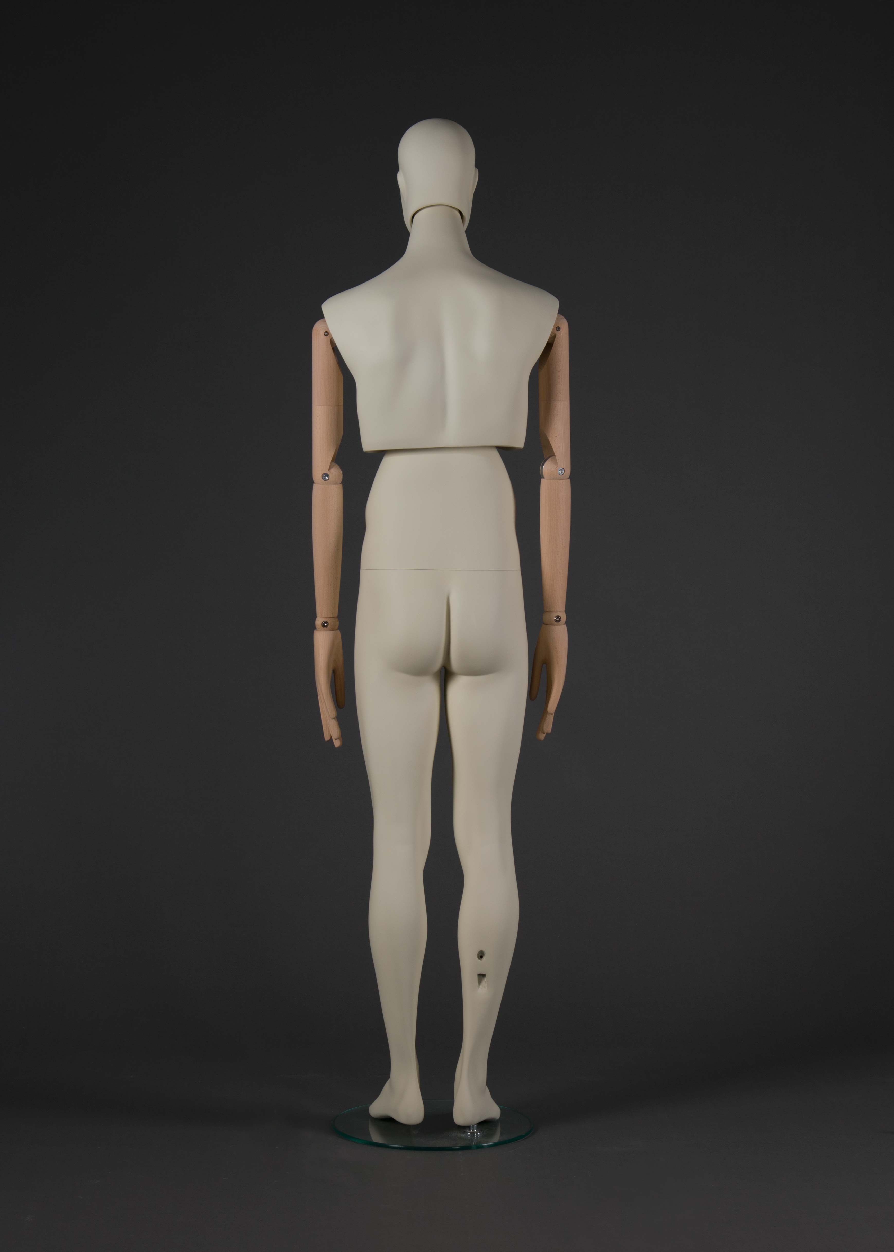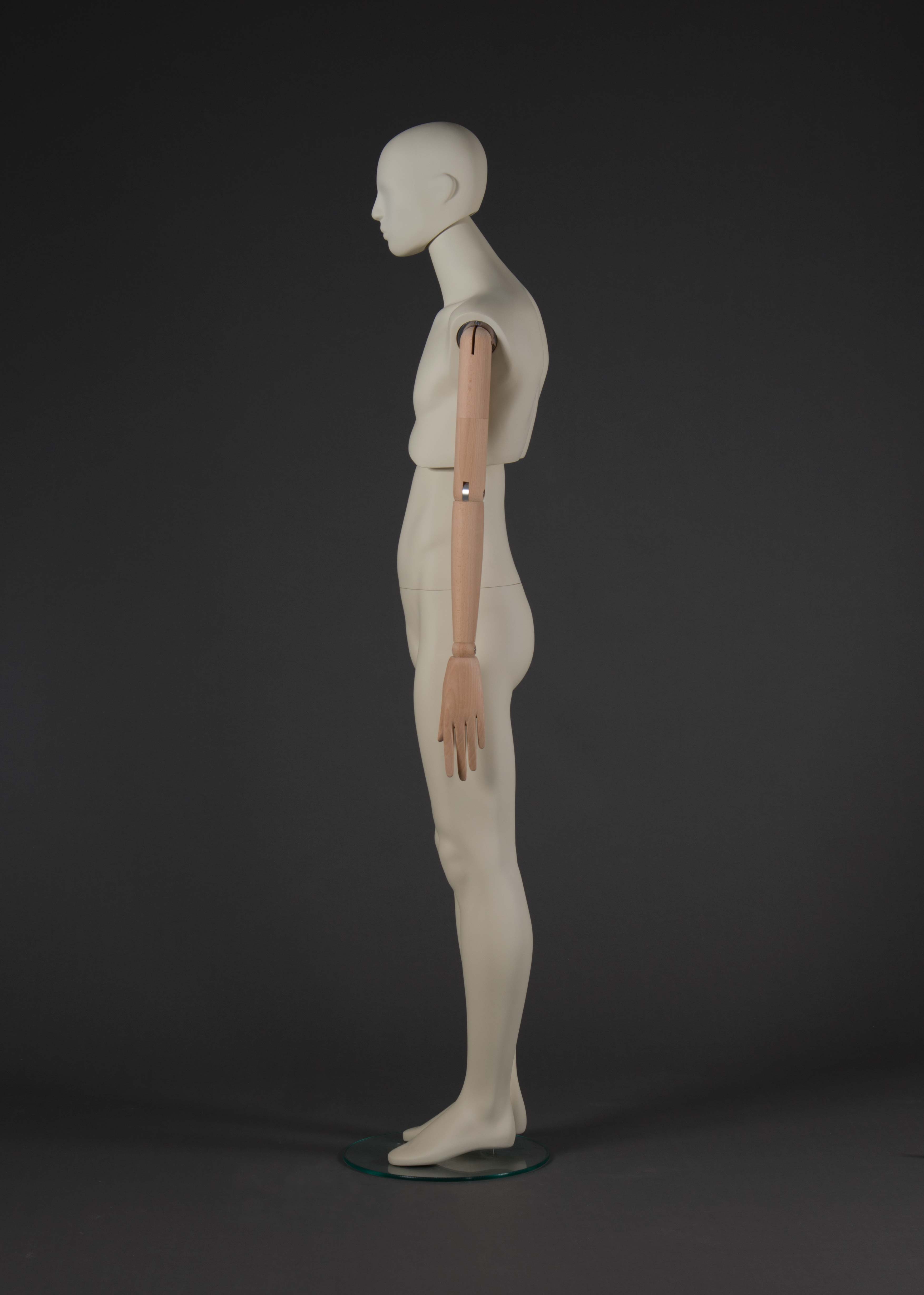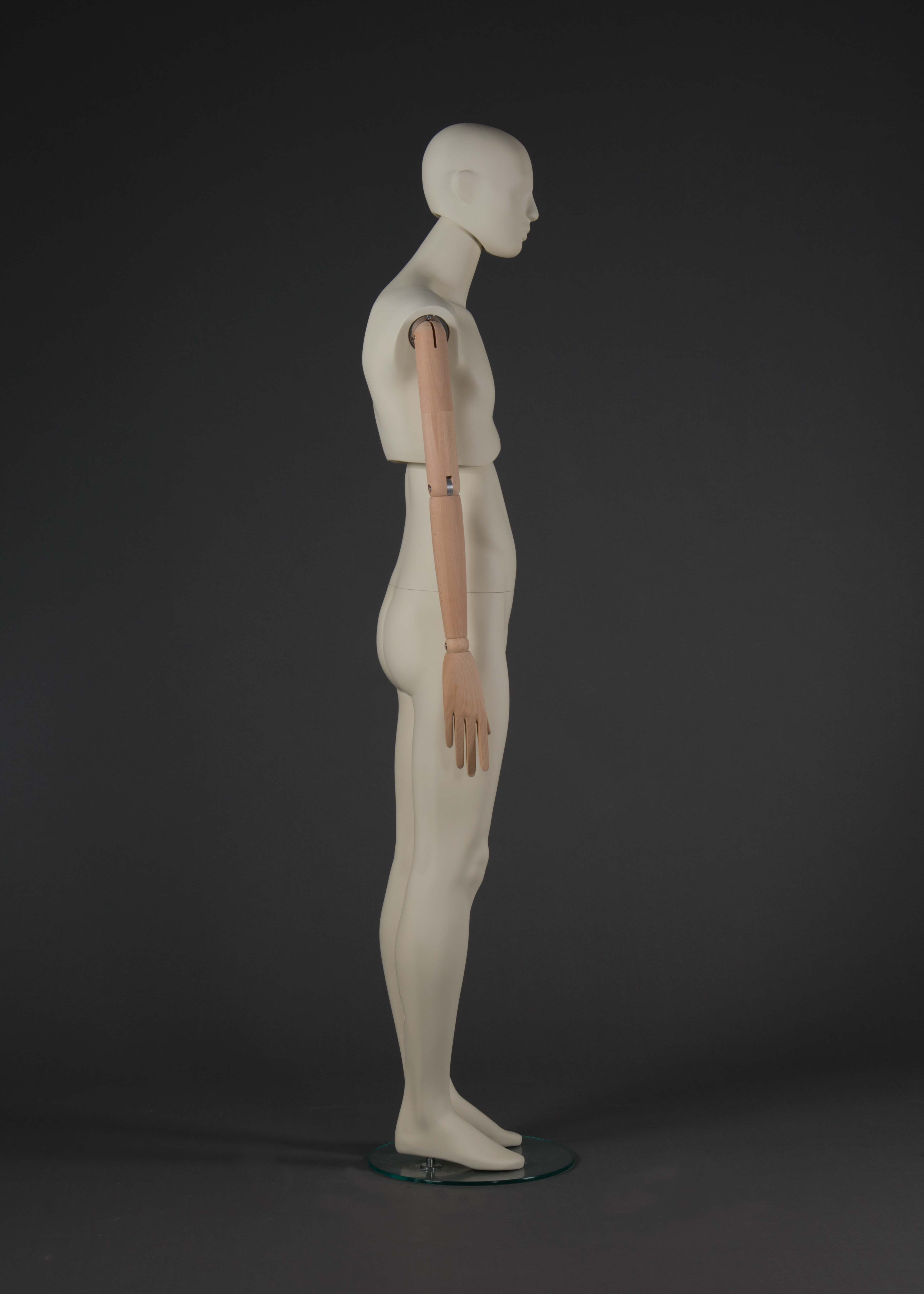 Diese moderne Schaufensterfigur für Männer kombiniert robusten Kunststoff mit lackierten Holzarmlen, die beweglich sind, um verschiedene Posen und Präsentationen zu ermöglichen. Diese Flexibilität macht sie ideal für eine vielseitige Nutzung in Schaufenstern und Verkaufsräumen.