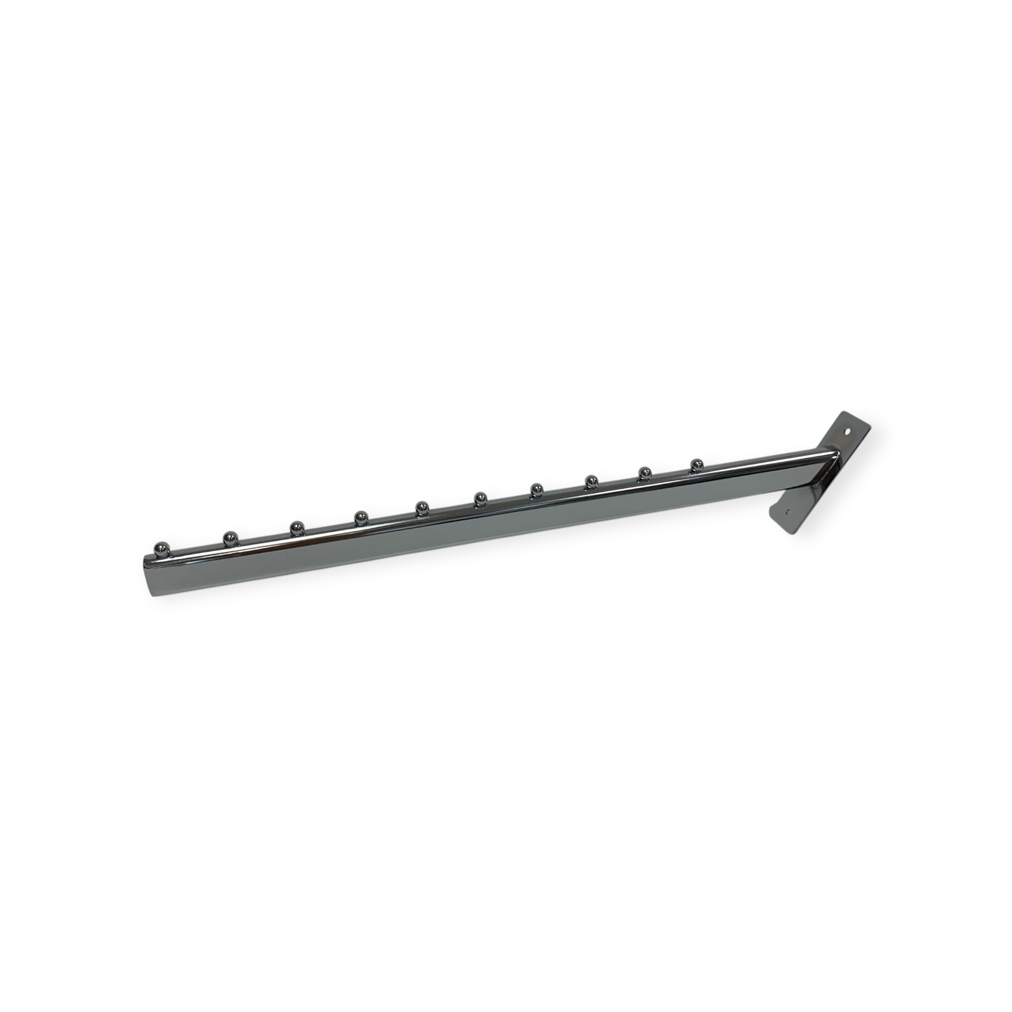 Dieser verchromte Schrägabhänger bietet eine besonders stabile und großzügige Lösung für die Wandbefestigung. Mit einer Länge von 47 cm und 10 robusten Stiften eignet er sich ideal zur übersichtlichen Präsentation von Kleidung, Accessoires oder anderen Artikeln im Verkaufsraum.