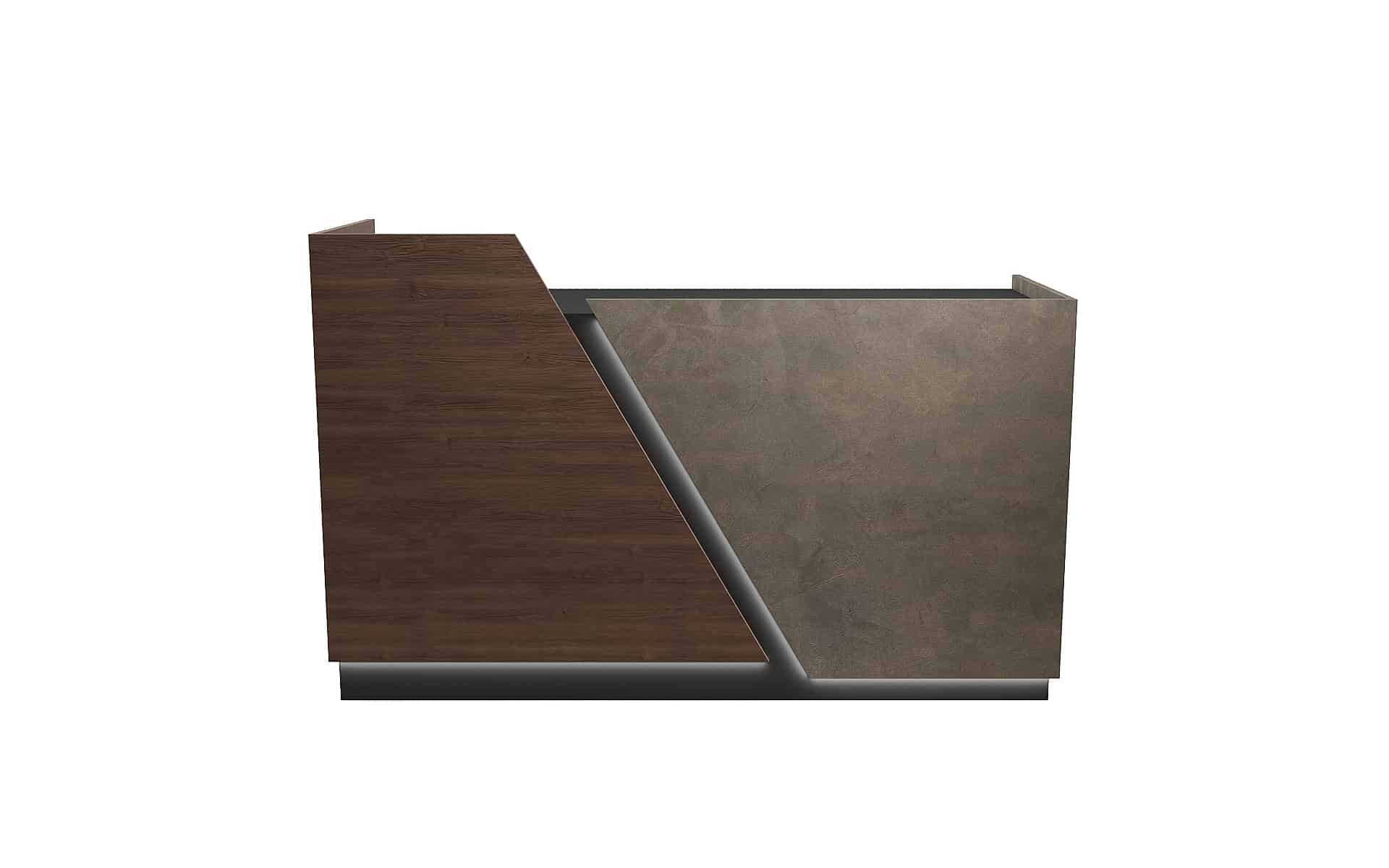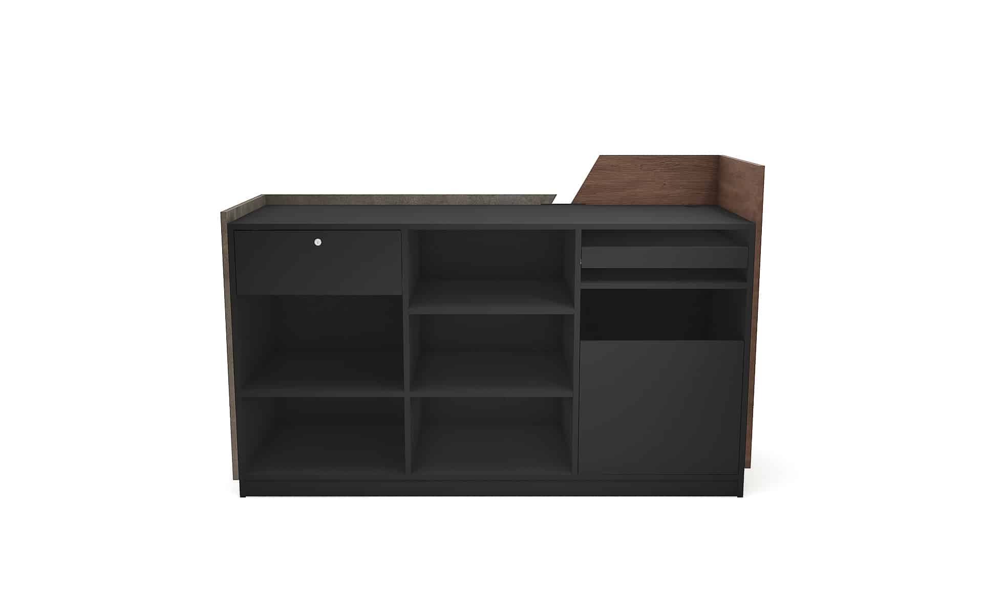 Die Front überzeugt mit einer hochwertigen Kombination aus mattschwarzem Melamin, Noce Bruno und Vulcano-Dekor, die deinem Verkaufsraum eine edle Note verleiht.
