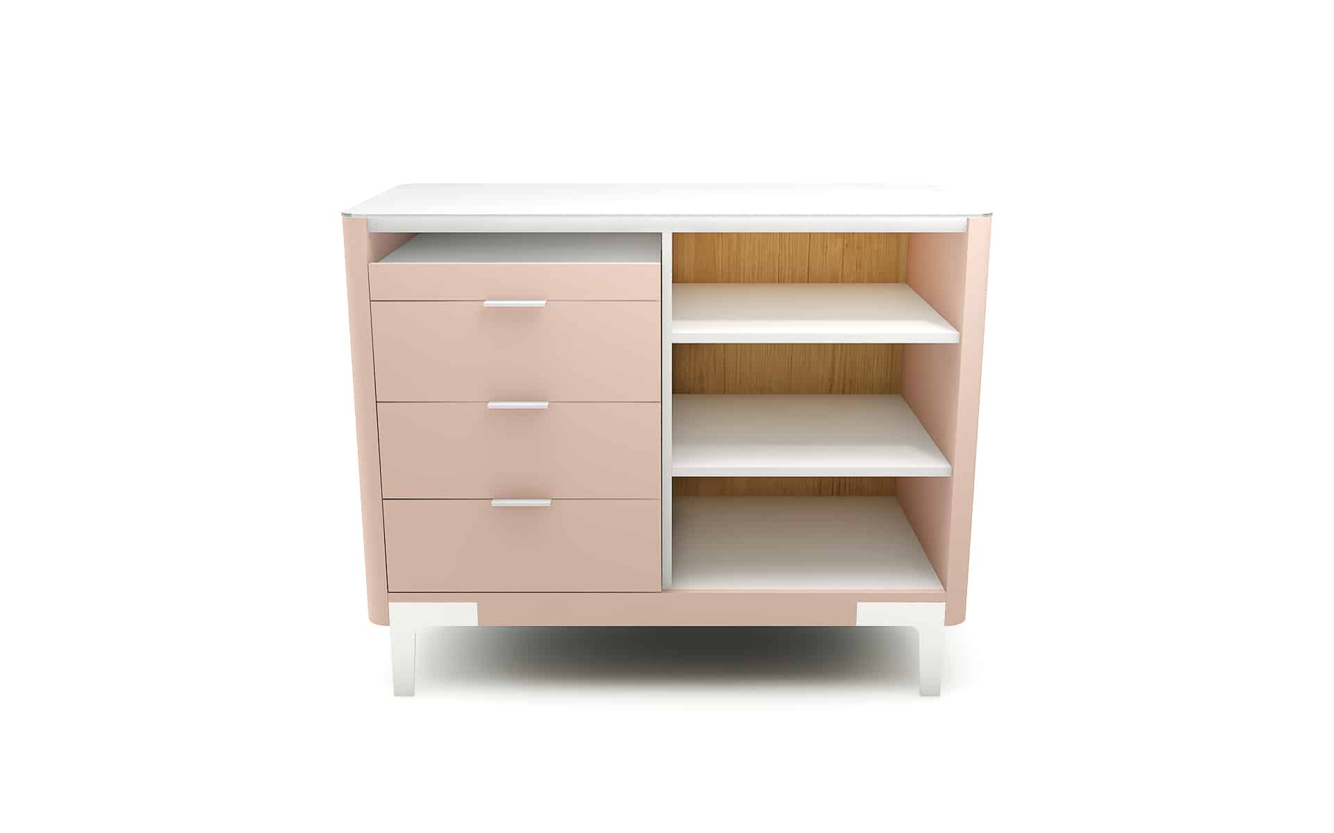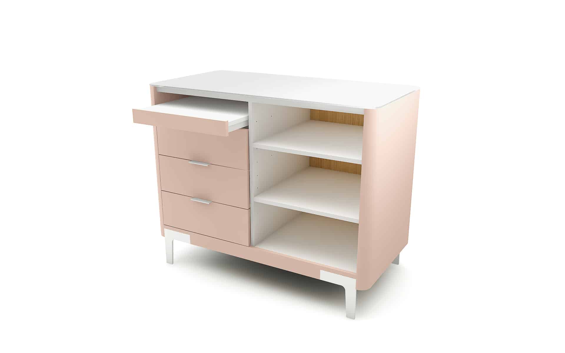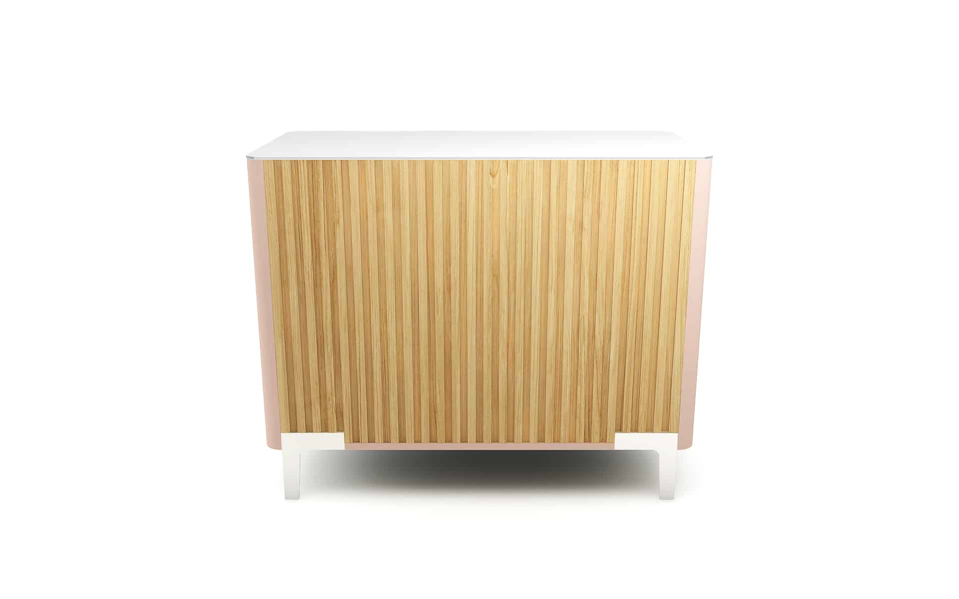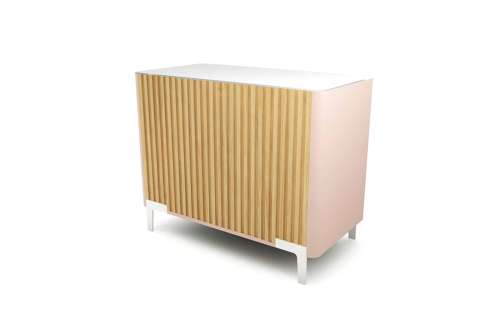 Die Front in Eichenlamellenoptik sorgt für eine warme, natürliche Ausstrahlung, die sofort ins Auge fällt. Ein sanfter Kontrast dazu: die lackierten Seitenteile in Quarzrosa, die dem Kassentisch eine moderne, feminine Note verleihen – ein echtes Design-Highlight.