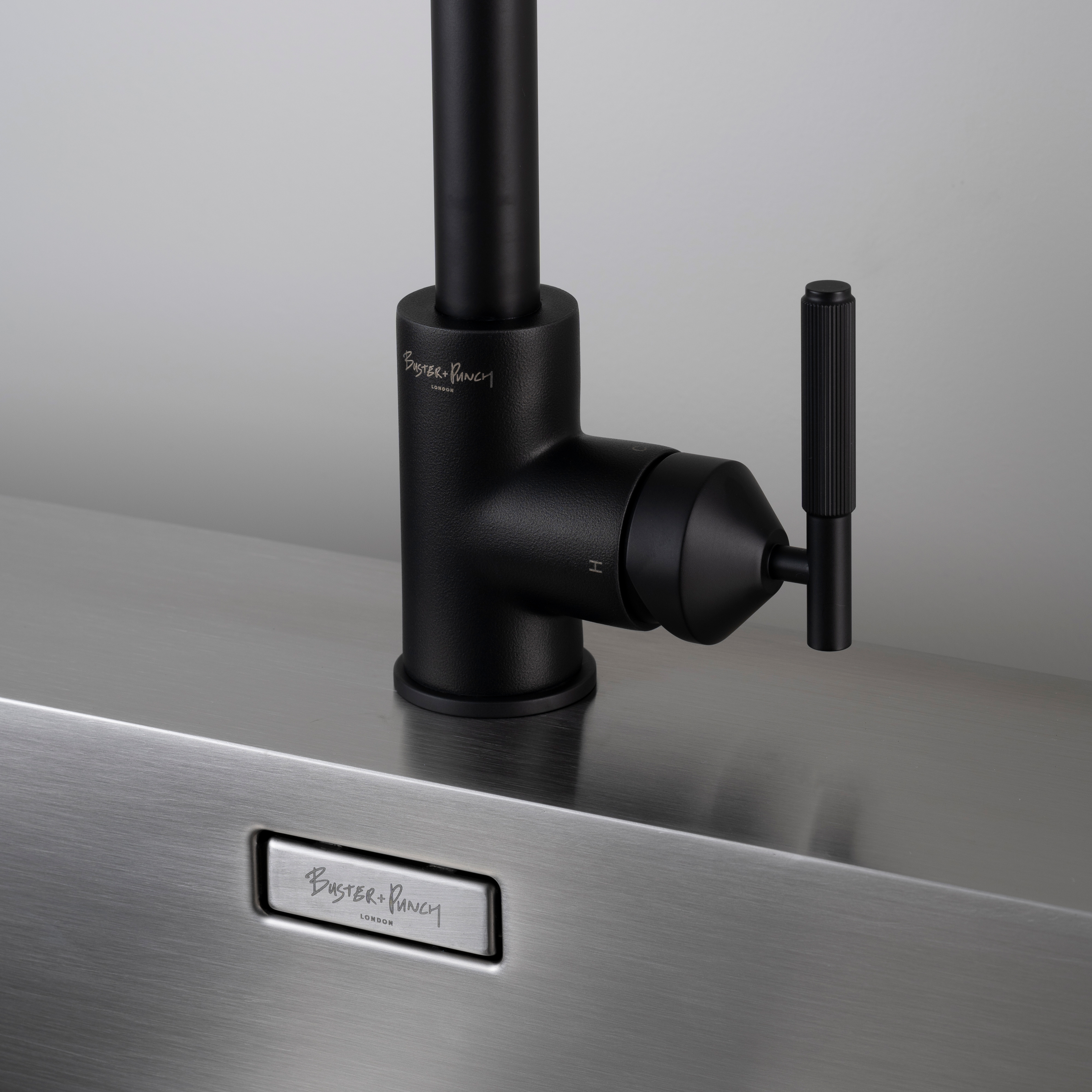 Die "Linear" Einhebel-Küchenarmatur in Matt Black kombiniert schlichtes Design mit höchster Funktionalität. Diese Armatur wurde mit besonderem Augenmerk auf Qualität und Ästhetik in Italien hergestellt. Sie ist aus massivem Metall gegossen, sandgestrahlt und bearbeitet, und trägt das markante linear-Rändelmuster. Jedes Detail wird von Hand veredelt, um die hohe Qualität zu gewährleisten.