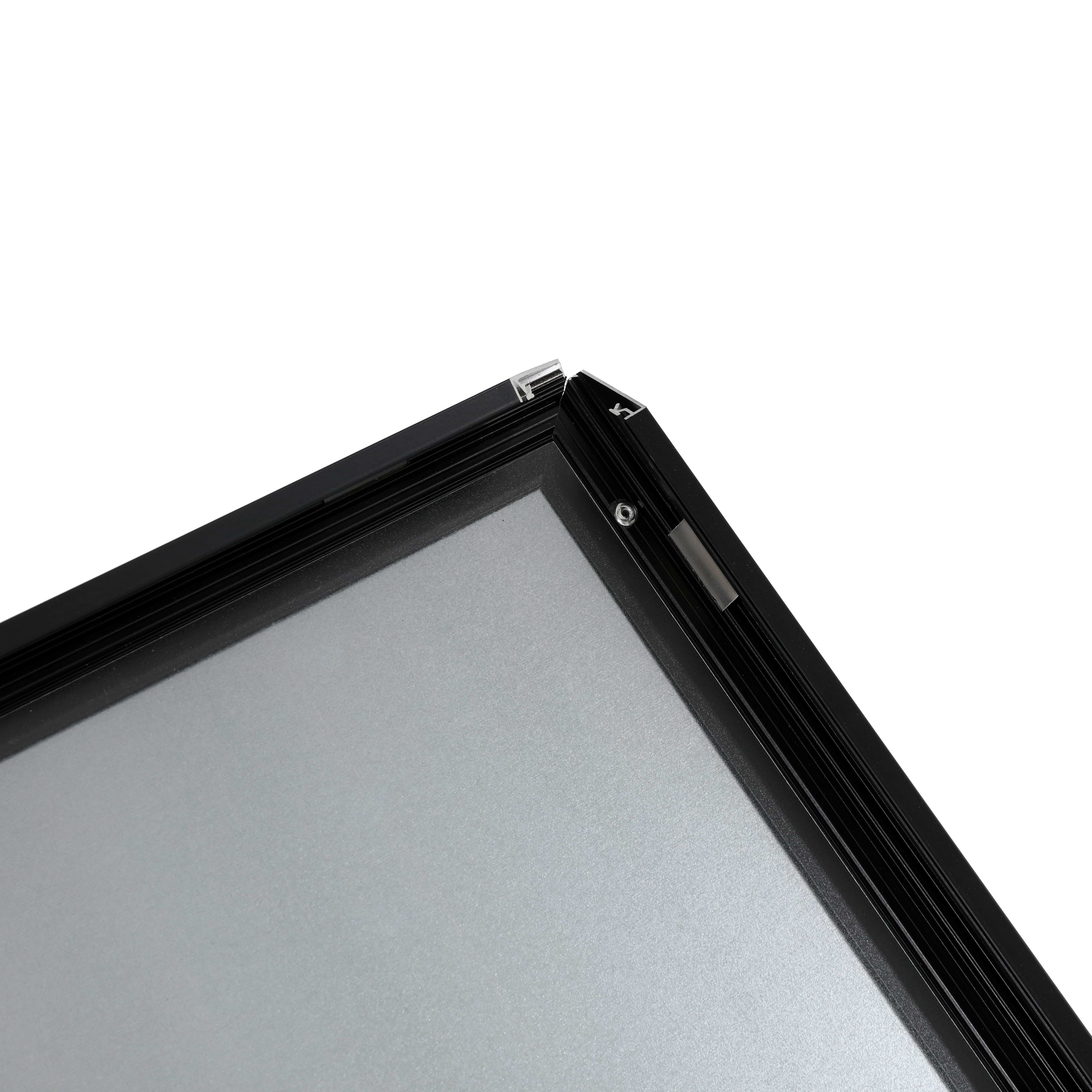 33 mm HardLine-Klappenrahmen in RAL 9005: Robuster Rahmen für einfachen Austausch von Werbematerialien. Die schwarze Farbgebung sorgt für eine edle Optik.