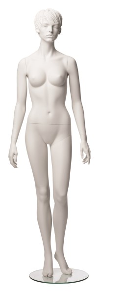 Die Schaufensterfigur ADRIANA in elegantem Weiß präsentiert sich ohne Make-up und wahlweise mit skulpturierten Haaren oder kopflos. Sie eignet sich ideal für eine moderne, zurückhaltende Warenpräsentation. Die Figur wird inklusive Sicherheits-Glasstandplatte, Fußdorn sowie einer Aufnahme für den Wadenstanddorn geliefert.