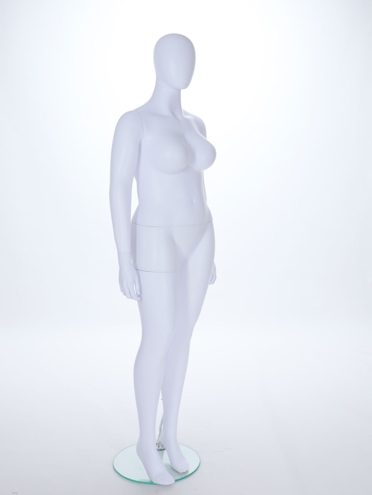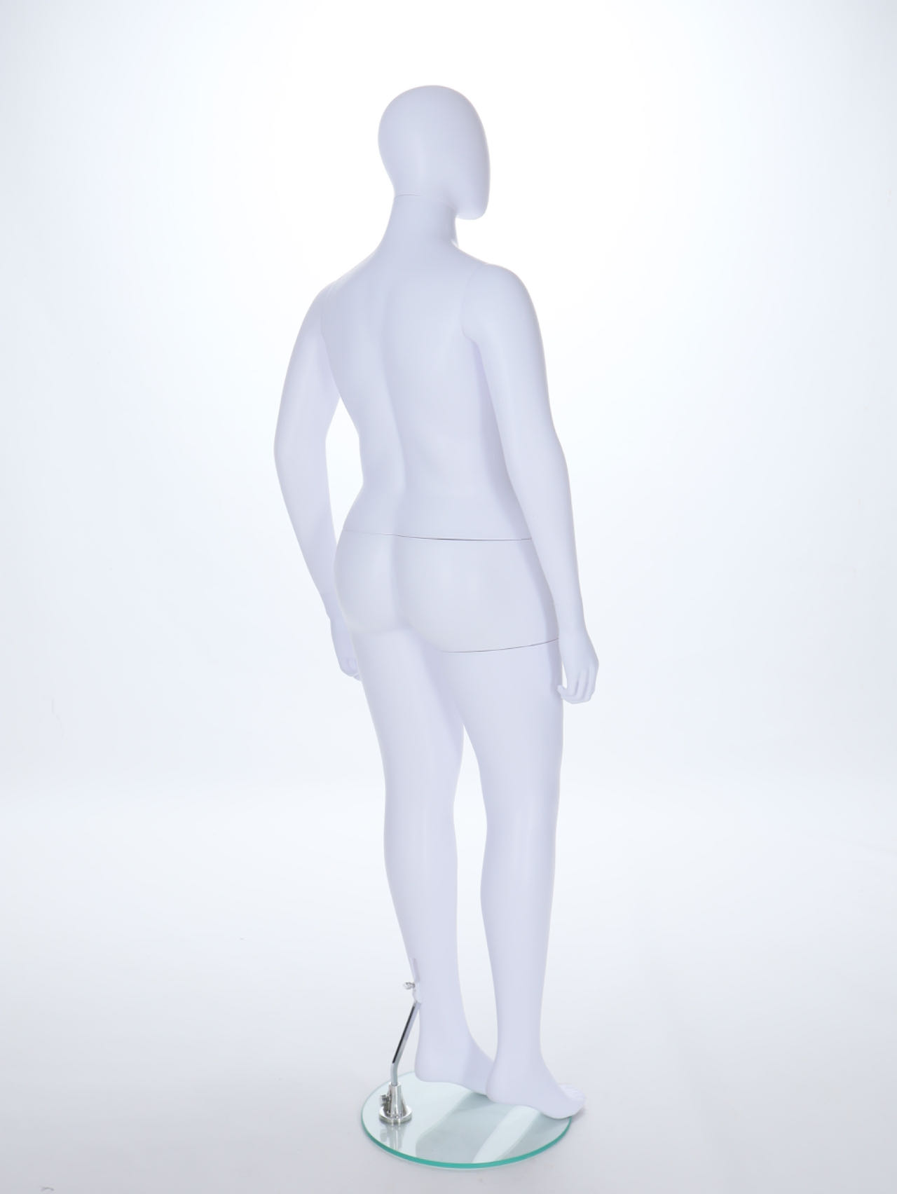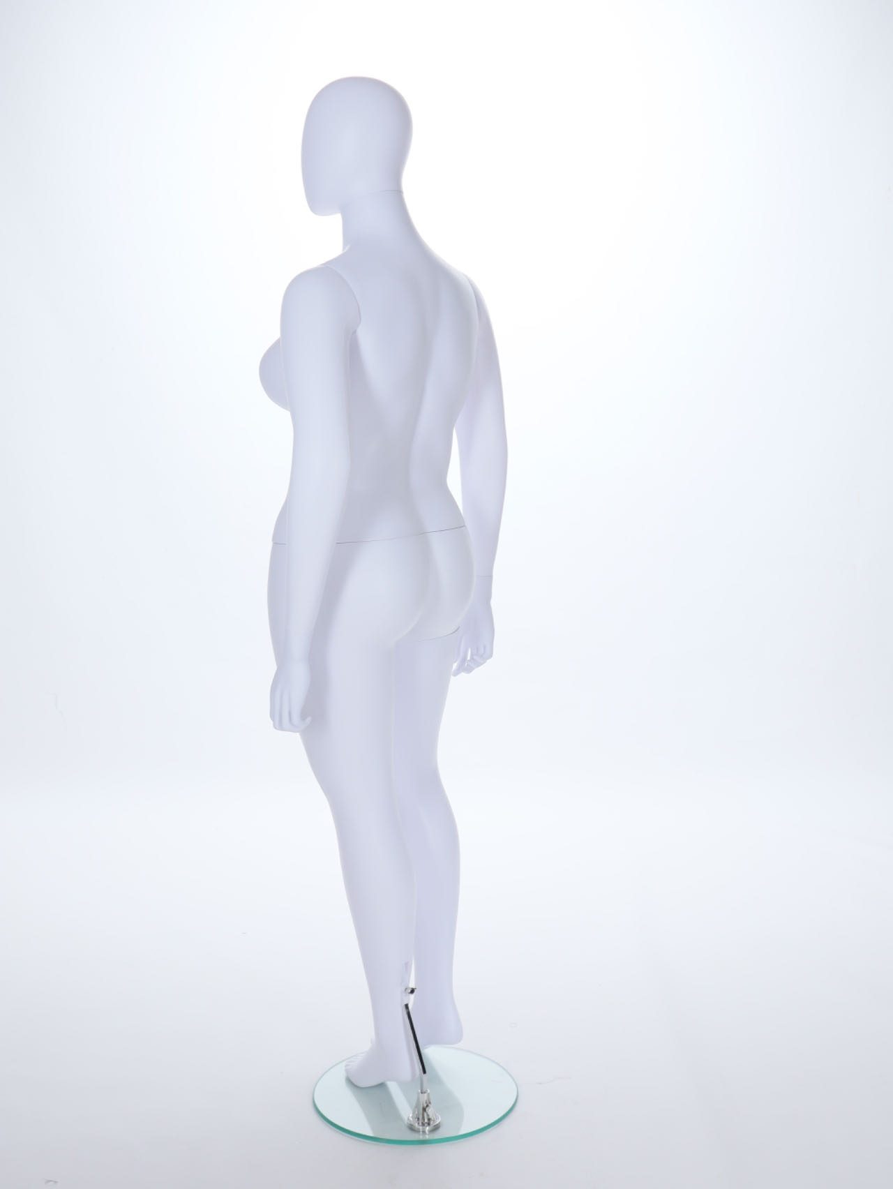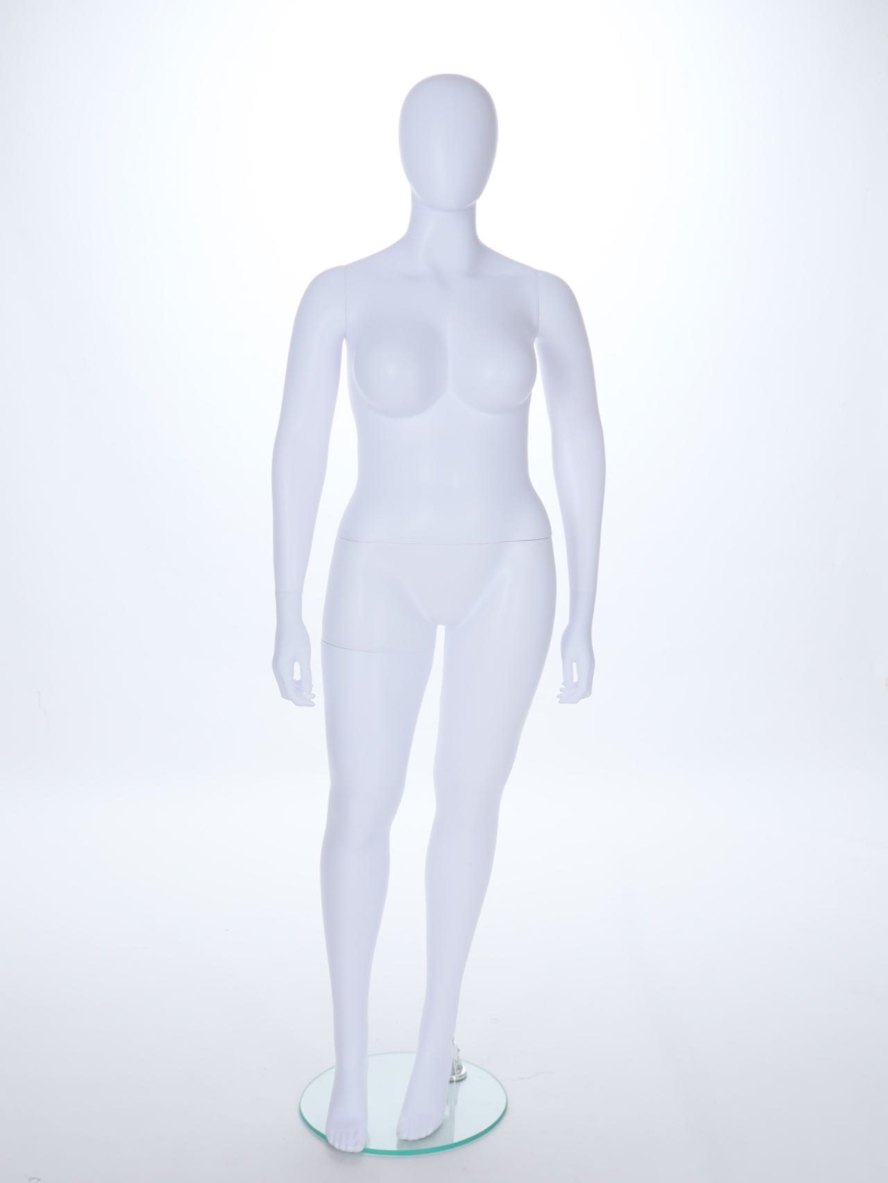 Die „XXL Frau“ Schaufensterfigur im Egghead-Stil ist in weiß, matt gehalten und aus hochwertigem Kunststoff gefertigt. Sie wird mit einer Glasplatte und einem Wadenstanddorn geliefert, um eine stabile und elegante Präsentation zu gewährleisten.