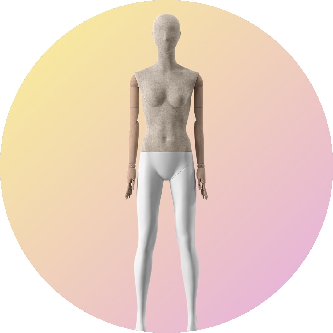 Die abstrakte Damenschaufensterfigur „MM“ besticht durch ein modernes Erscheinungsbild mit warmen, natürlichen Akzenten. Kopf und Rumpf sind mit beigem Leinenstoff bezogen, die Beine in elegantem Weiß matt lackiert. Verstellbare Holzarme und ein abnehmbarer Kopf sorgen für maximale Flexibilität in der Warenpräsentation.