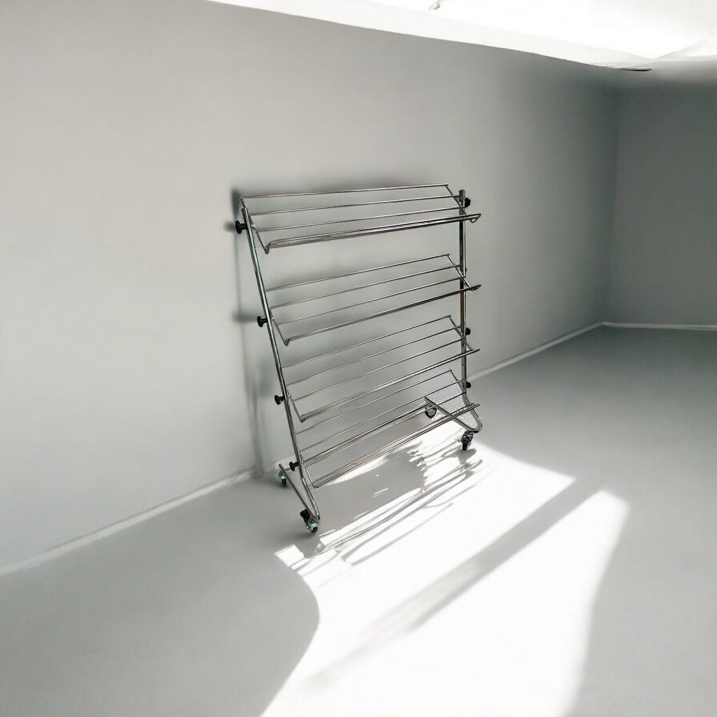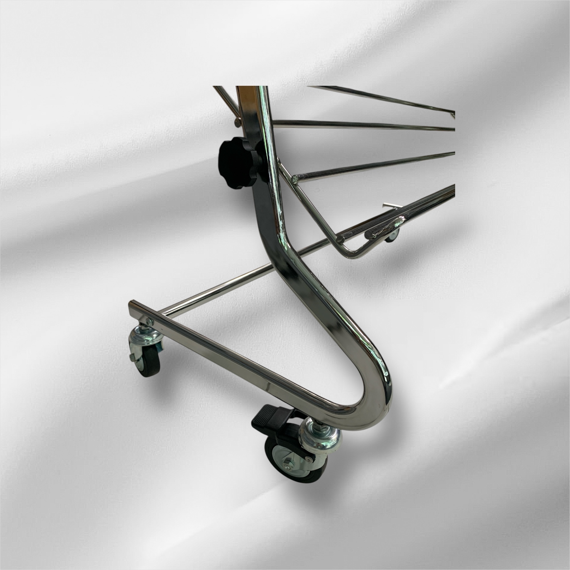 Gefertigt aus stabilem, ovalem Stahlrohr (30 × 15 mm), verchromt für eine glänzende und pflegeleichte Oberfläche, überzeugt der Ständer durch Langlebigkeit und Stabilität. Die solide Rahmenkonstruktion garantiert eine sichere Aufbewahrung auch bei voller Beladung.