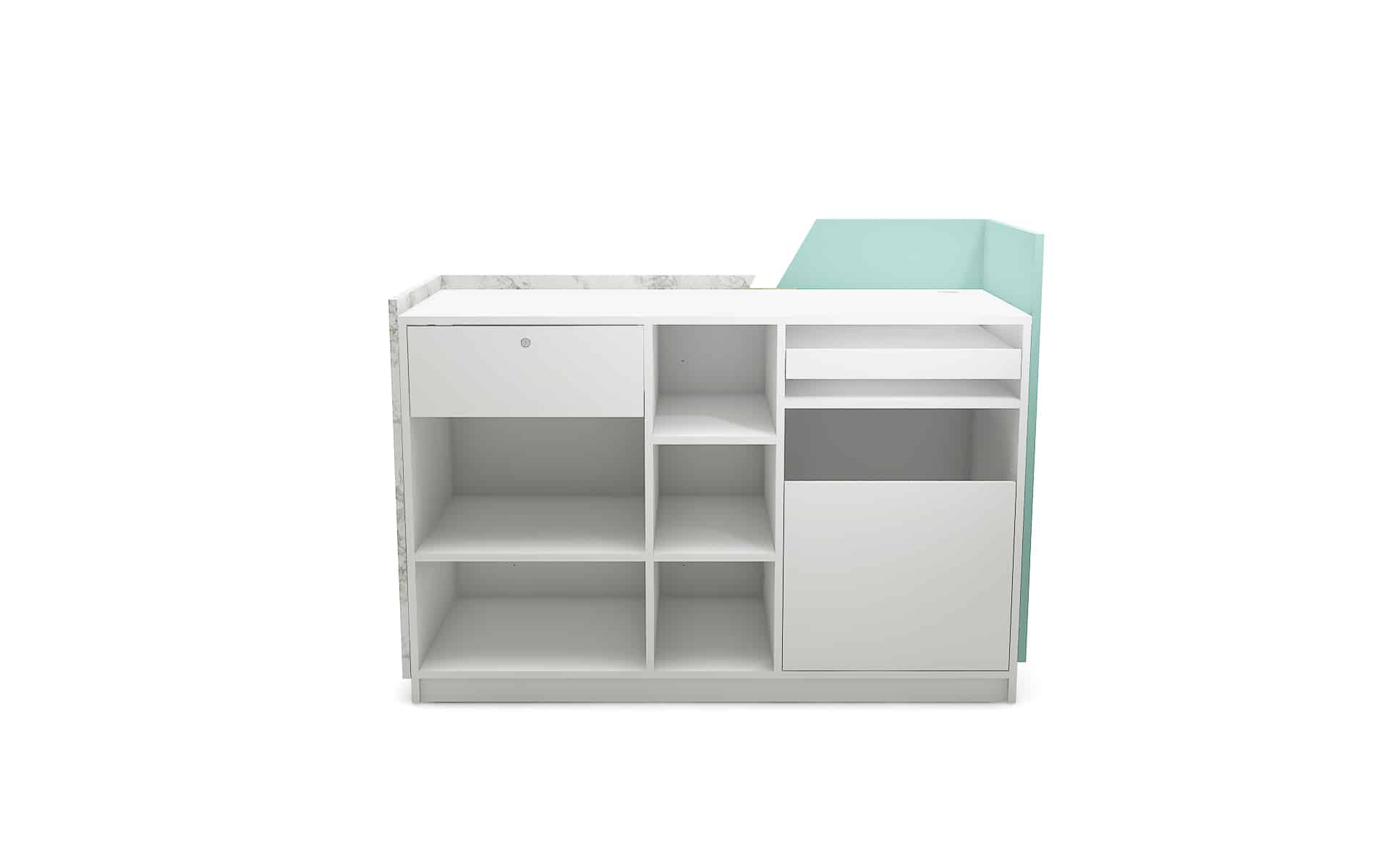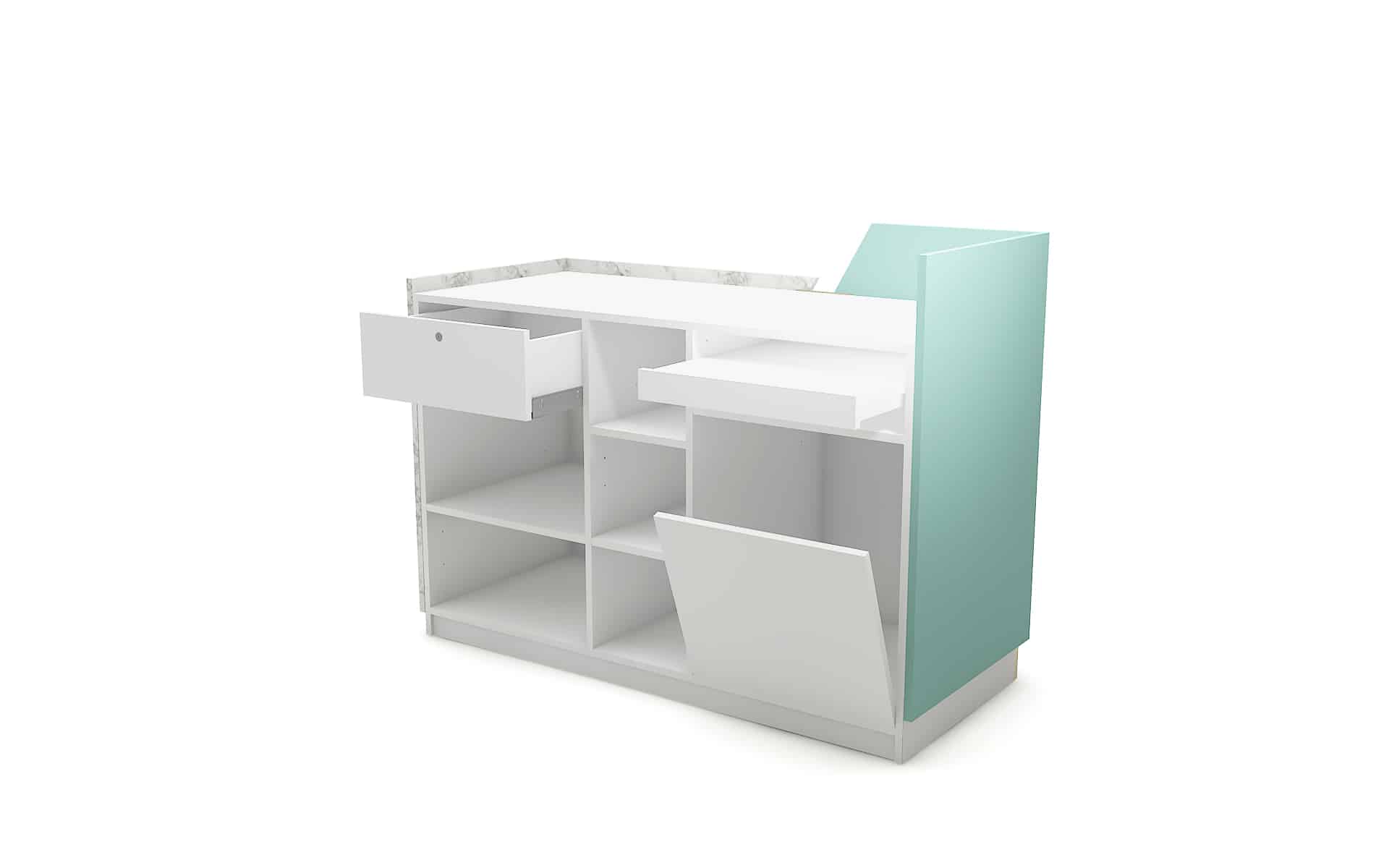 Diese hochwertigen Materialien sorgen für eine langlebige und ansprechende Optik. Der Kassentisch bietet hintere Organisationsmöglichkeiten, darunter eine abschließbare Schublade für sichere Aufbewahrung, verstellbare Einlegeböden für flexible Nutzung sowie ein herausnehmbares Tablett, das die Arbeit erleichtert.