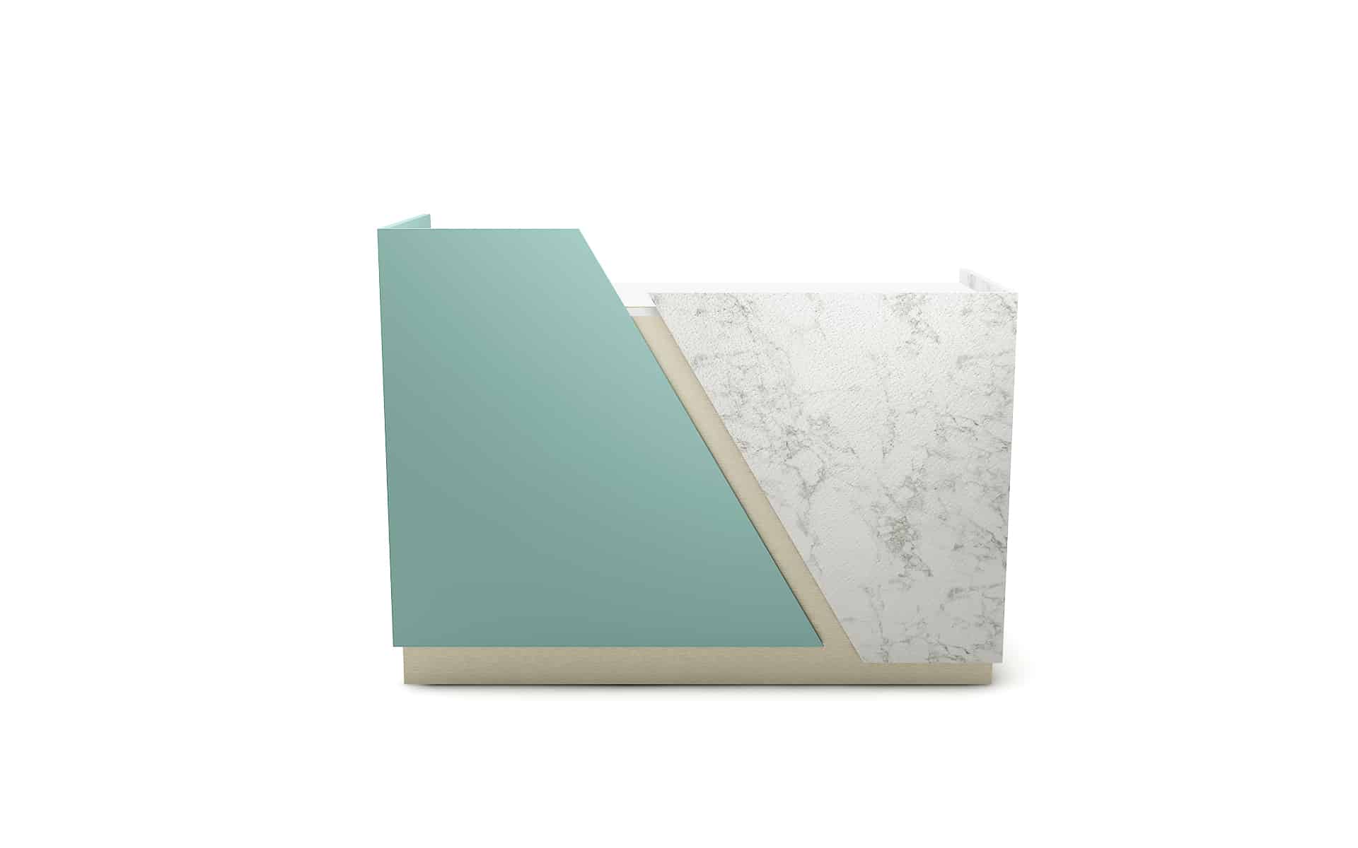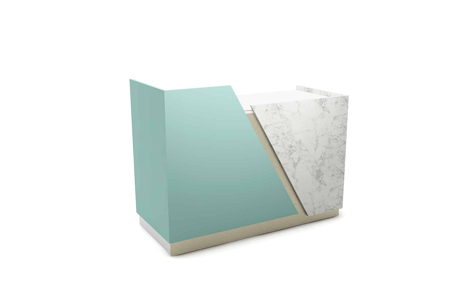 je nach gewählter Variante. Das Design besticht durch eine elegante Kombination aus satiniertem Champagnerlaminat und Frontelementen aus lackiertem Melamin in den Farben Paradise Azure und White Marble.