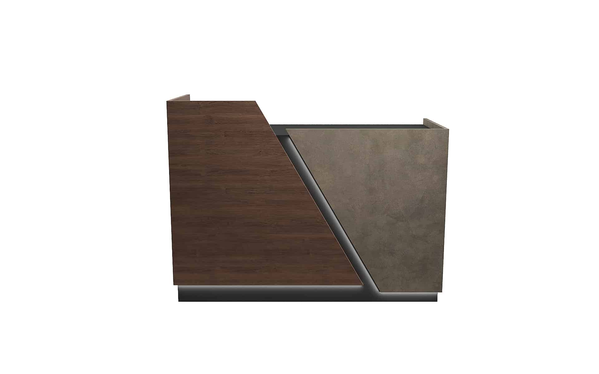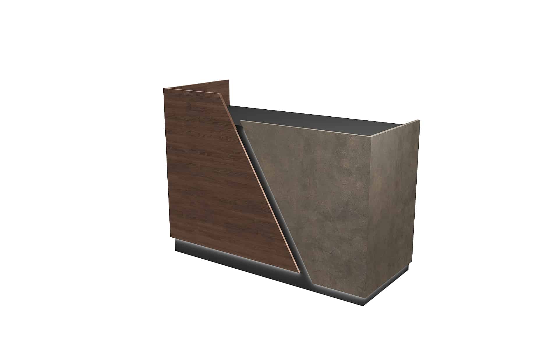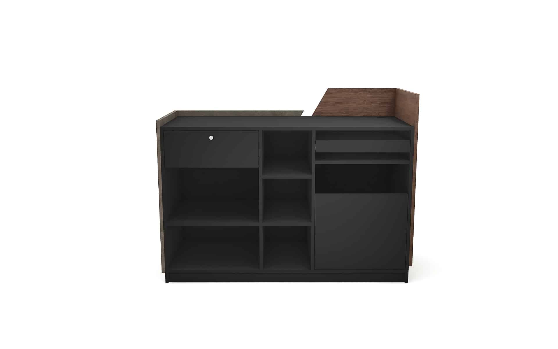 Die Front überzeugt mit einer hochwertigen Kombination aus mattschwarzem Melamin, Noce Bruno und Vulcano-Dekor, die deinem Verkaufsraum eine edle Note verleiht.
