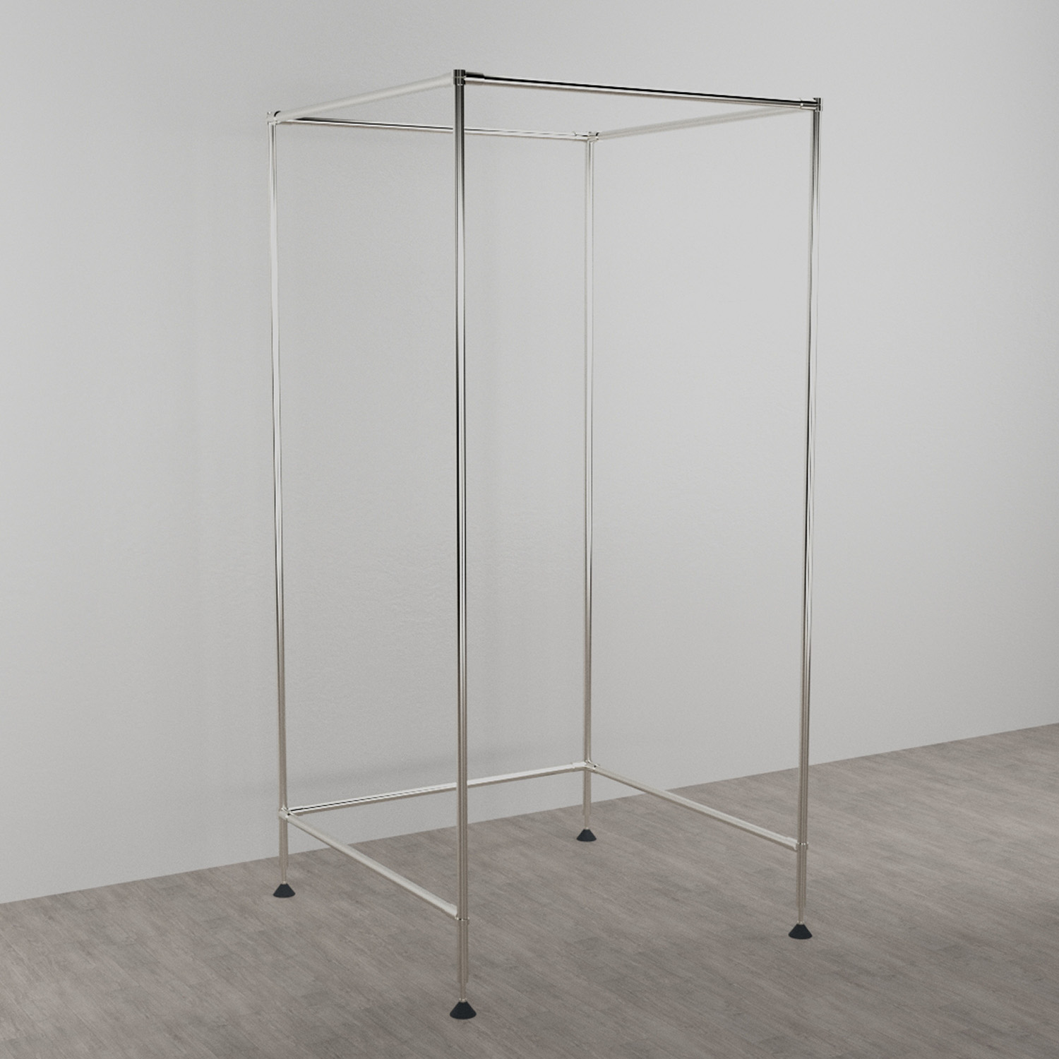 Diese Kabine aus Rundrohr bietet eine stabile und elegante Lösung für die Präsentation oder Nutzung in Verkaufsräumen, Umkleidebereichen oder Ausstellungen. Die verchromte Oberfläche sorgt für eine hochwertige Optik und eine lange Lebensdauer. Mit den Außenmaßen von T=100 cm, B=100 cm und H=200 cm bietet sie ausreichend Platz für eine komfortable Nutzung. Zudem besteht die Möglichkeit, die Kabine mit Rollen auszustatten, um eine einfache Mobilität zu gewährleisten.